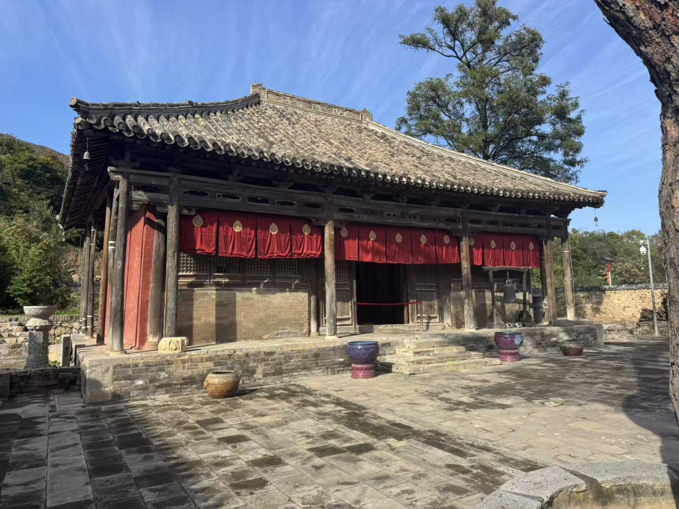 在灵岳寺前的空地上,停放着不少游客的私家车。始建于唐贞观年间寺院坐北朝南,虽仅约2000平方米,但山门、天王殿、大雄宝殿、两厢配殿等殿阁楼宇一应俱全,全院方砖铺地。门楣上的字迹和墙上的壁画已经模糊,只能隐约辨识出一些轮廓。梁柱的裂痕和深浅不一的砖石颜色无不诉说着千年来世事变迁。