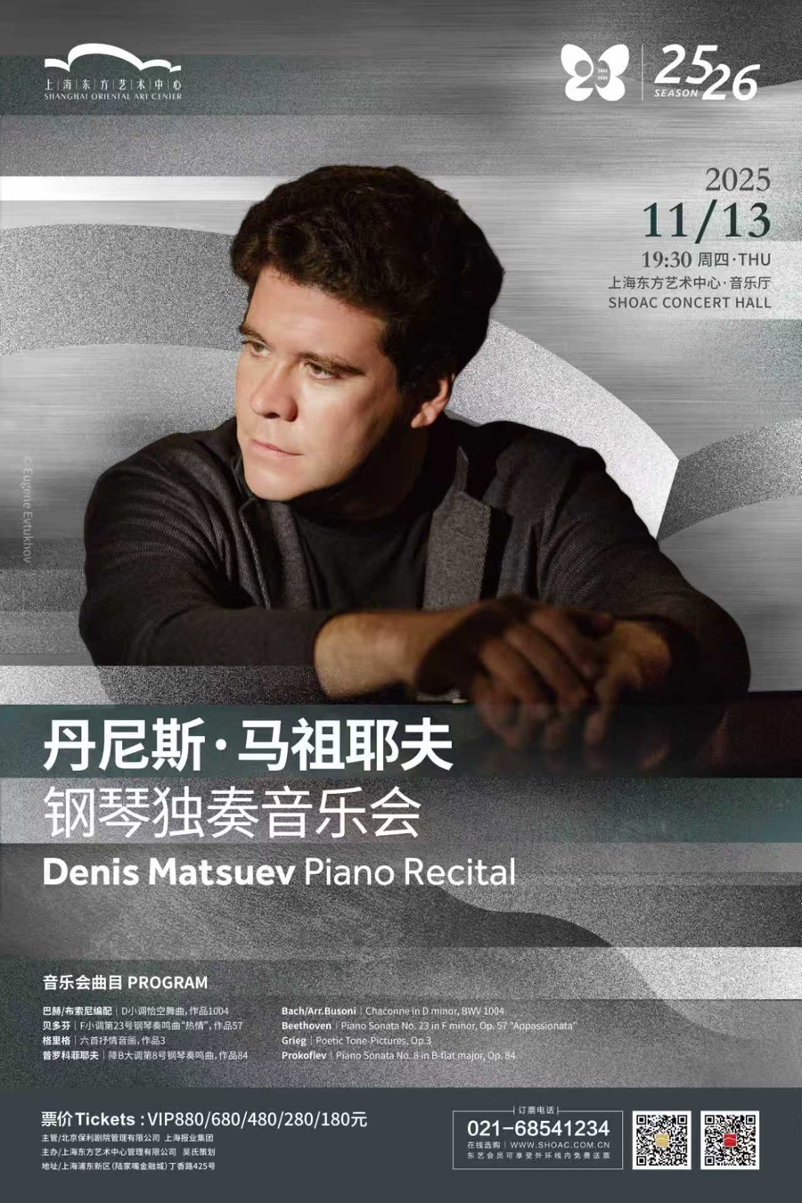 除了宏大的交响版图,东艺舞台同样聚焦大师个人艺术光芒。11月13日,当代俄罗斯钢琴学派代表丹尼斯·马祖耶夫再次挑战炫技与情感浓度的极限。音乐会将以巴赫《D小调恰空舞曲》(布索尼改编版)开篇,随后是尽显其触键力度与情感张力的贝多芬《“热情”奏鸣曲》,传递内敛诗意的格里格《六首抒情音画》,最后以普罗科菲耶夫“战争三部曲”中最富抒情性的《第八钢琴奏鸣曲》收尾。