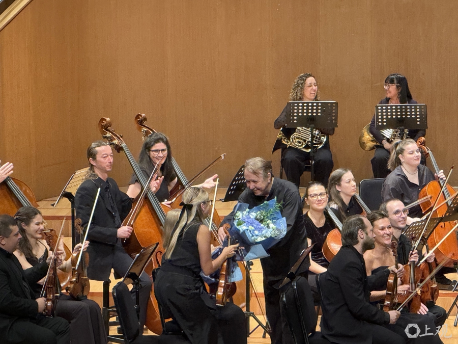 上海首场音乐会,普莱特涅夫将收到的鲜花转赠乐团成员。施晨露摄