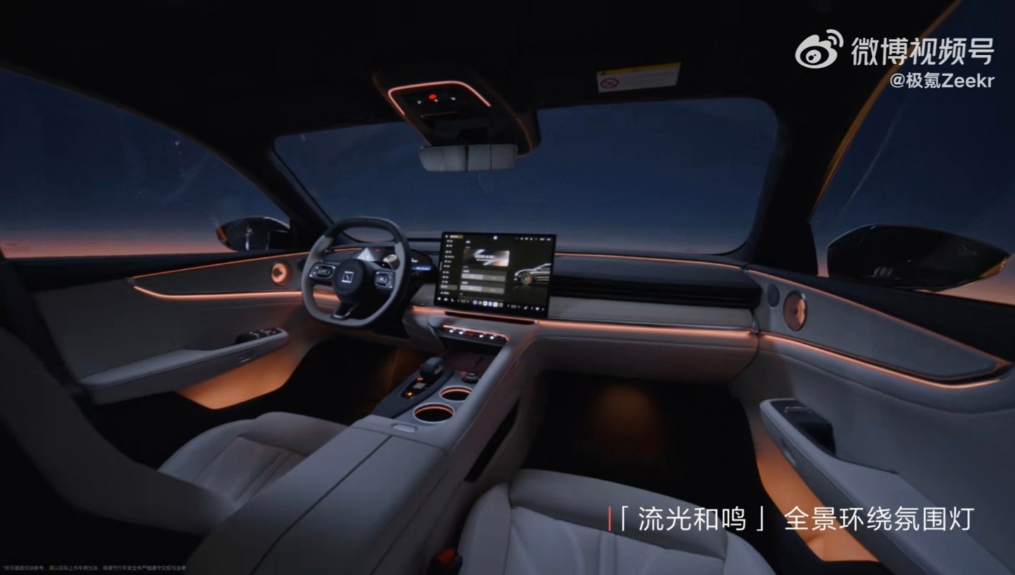 根据极氪此次的预热,新车配有“流光和鸣”全景环绕氛围灯,覆盖范围从中控台延伸至门板,官方视频中,在车门储物槽、音响乃至杯架处甚至都有灯光点缀。