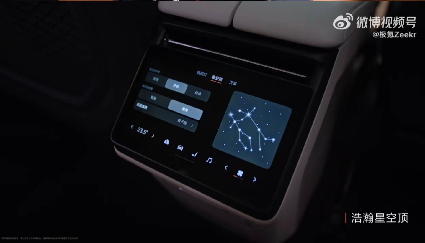 不仅如此,新车配备“浩瀚星空顶”,还可通过后排空调出风口区域的控制屏来调整样式,譬如呈现出某个星座的图案。