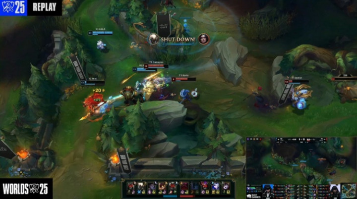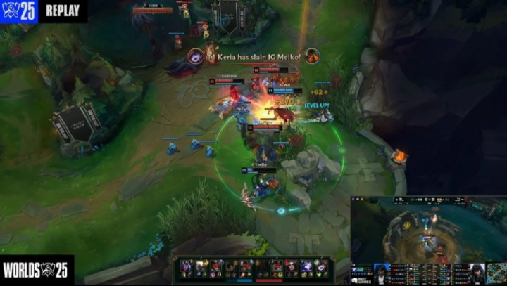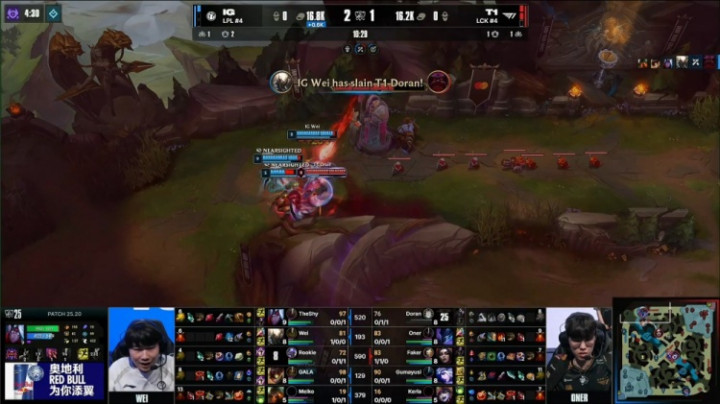 【25:31】T1中路推进,Meiko泰坦闪现钩打出Keria璐璐闪现,大龙团,Rookie塞拉斯拿到羊,正面多兰奥恩关灯羊配合Faker妖姬进场收割,T1打出0换4,一波推平iG基地拿到比赛胜利。
