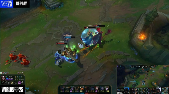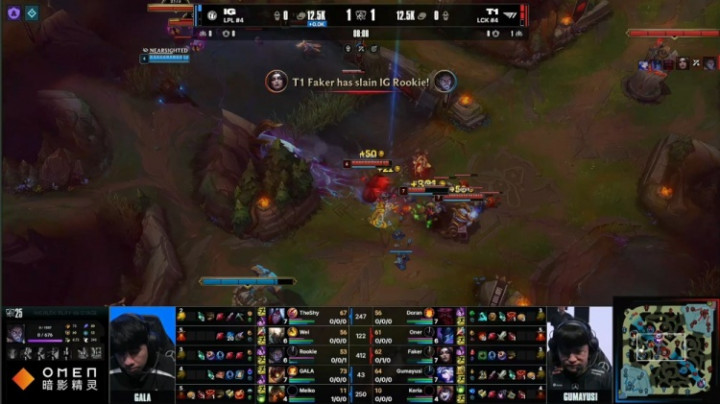 【8:09】中路Oner关灯配合多兰奥恩叫羊撞飞Rookie塞拉斯,Faker妖姬拿到Rookie人头,iG拿到两条巢虫,T1拿到三条巢虫。