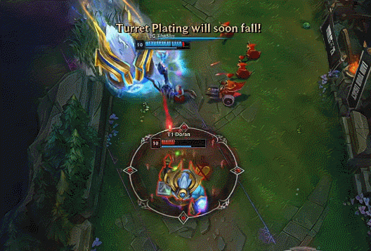 【10:20】上路2V2,Oner梦魇关灯飞上,iG三人越塔,Meiko泰坦进塔钩住多兰与之互换,双方打出1换1。